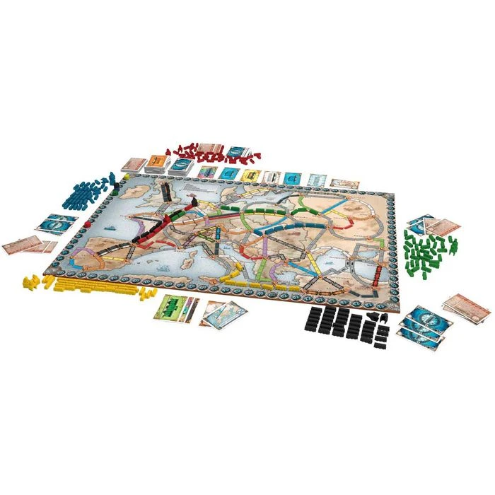 Lieferumfang: 1 Spielbrett, 225 farbige Waggons, 15 farbige Bahnhöfe, 144 farbige Spielkarten, 5 Zählsteine, 1 Regelheft