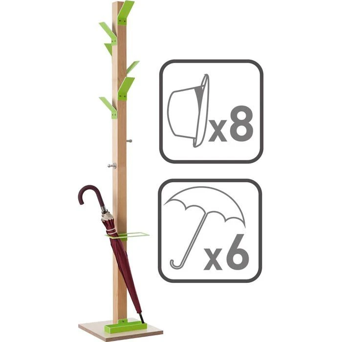 sonstiges: 6 farbige Kleiderhaken aus robustem Polystyrol und 2 zusätzliche Haken aus verchromtem Stahl, Massivholz-Ständer transparent lackiert, Schirmhalter mit Tropfmulde, standsicher durch wasserfesten Standfuß aus Sperrholz