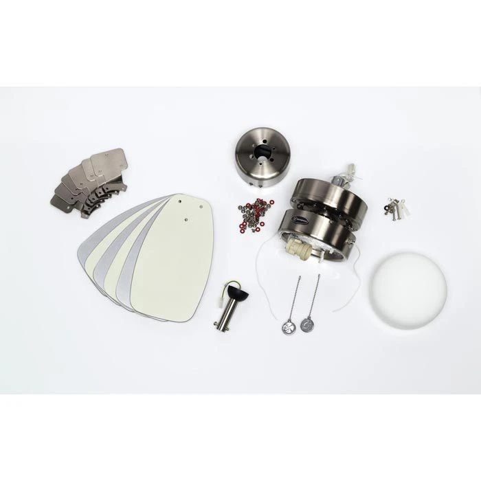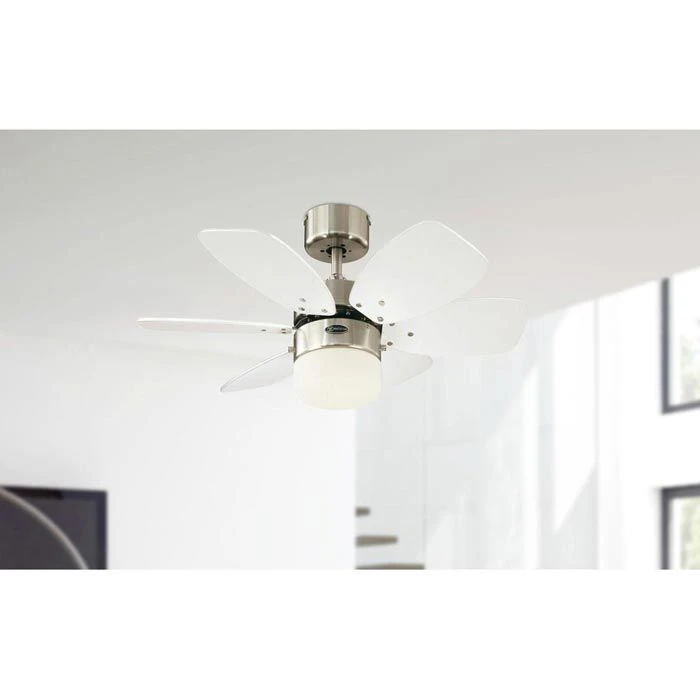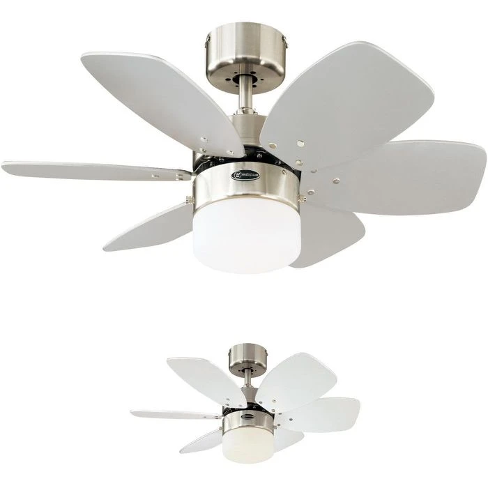 sonstiges: prakitsche Wendeflügel aus MDF bieten die Auswahl zwischen weiß und silbernem Design, Licht und Ventilator sind separat schaltbar, angenehmes Klima im Sommerbetrieb (nach unten gerichteter Luftstrom erzeugt kühlende Wirkung) und optimale Wärmeverteilung im Winterbetrieb (nach oben gerichteter Luftstrom bläst warme Deckenluft nach unten, man spart bis zu 30% Heizkosten), Montage mit und ohne Zwischenstange möglich