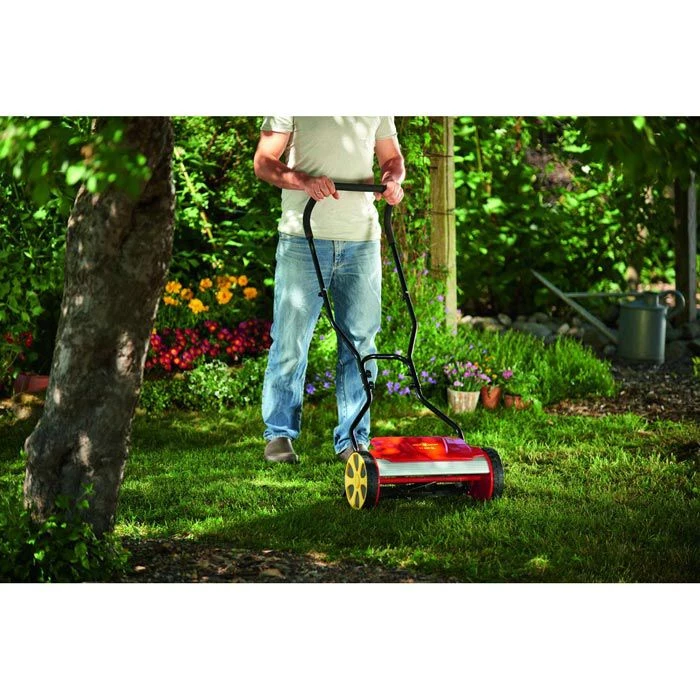 sonstiges: beim Schieben dreht sich eine mit Messern besetzte Walze an einem feststehenden Gegenmesser vorbei, dabei wird der Grashalm erfasst und sauber geschnitten, da sich Messerwalze und Untermesser nicht berühren, ist der Einsatz des Mähers besonders leise und leicht in der Handhabung, kugelgelagerte Messerwalze, Griff mit angenehmem Softgrip