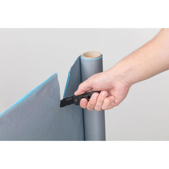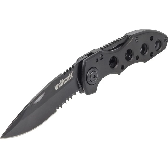 • Klinge mit gezahnte Schneide aus rostfreiem Stahl brüniert